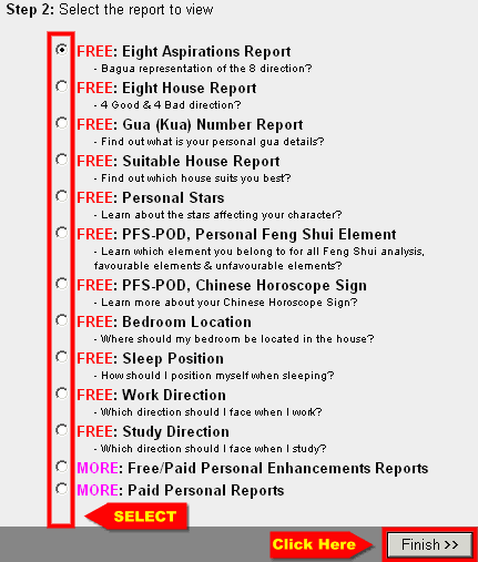 - Next is to select the report to generate. In this case, select the Gua (Kua) Number Report and click FINISH.